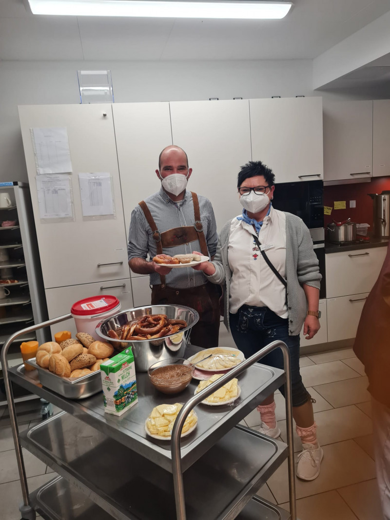 Mit Dirndl und Lederhose möchte unsere Betreuerin Manu und der Chefkoch etwas Farbe, Freude und Abwechslung in den Tag bringen.